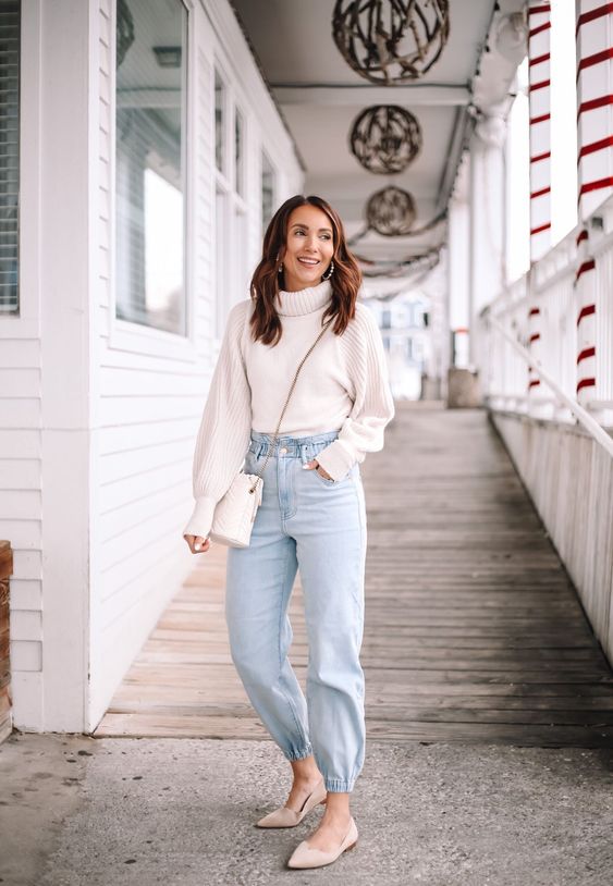 Для походу в кіно або зустрічі з подругами надягайте небесно-блакитні джинси джогери, водолазку або светр із широким горлом, трендові балетки та сумку через плече. Доповніть образ непомітними аксесуарами.