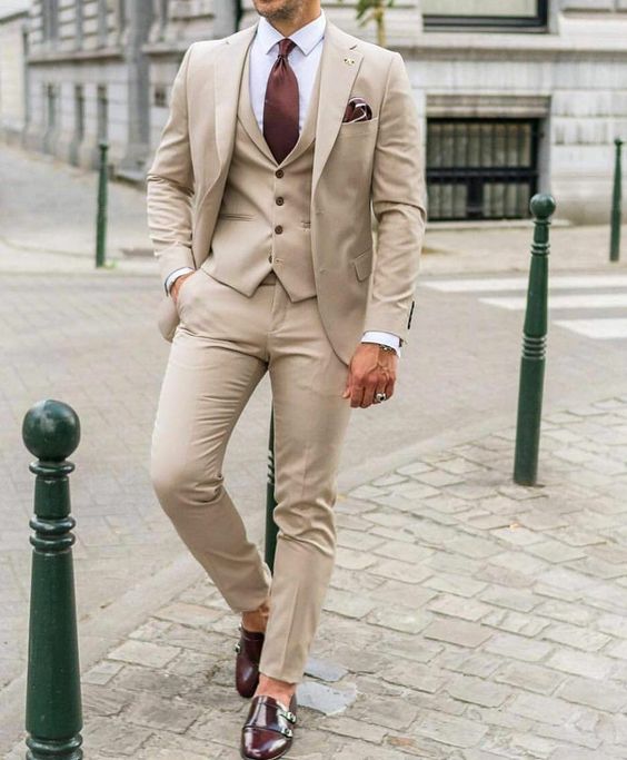 Також для випускного вечора можна приглянути стильний костюм-трійку бежевого відтінку, який складається з штанів, жилету та піджака. Доповніть лук білою сорочкою, коричневою краваткою та трендовим чоловічим взуттям – туфлями монкі. Це взуття без шнурівки, але з однією, двома або трьома пряжками. Замість туфель можна одягнути білі кеди, тоді образ вийде більш розслабленим.