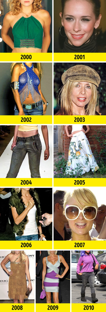 Нульові прийшли в світ моди з пляжними топіками, лосинами, сережками-кільцями, низькими джинсами. Одним з хітів були велюрові берети. Знову ж, як у Брітні Спірс. Також в тренди повернулися штани-кльош і довгі пишні спідниці. Піком крутості були паєтки, глибоке декольте і величезні окуляри. Ну а взимку красуні масово ходили в пухнастих жилетках і уггах.