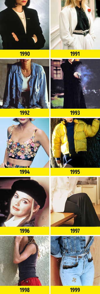 Дев'яності запам'яталися великою кількістю деніму, велюру і оксамиту, бриджами, оверсайзом. Також модно було носити ділові костюми, спідниці середньої довжини, спортивні куртки і штани. Дуже популярними були такі речі, як вовняне або джинсове пальто (таке було навіть у самої Брітні Спірс), міні, тваринні принти. Взимку модниці носили пуховики, а восени любили красуватися в беретах. Ну і, кажучи про 90-і, не можна не згадати короткі топіки і велику платформу. Цю моду привили світові учасниці популярної поп-групи Spice Girls.