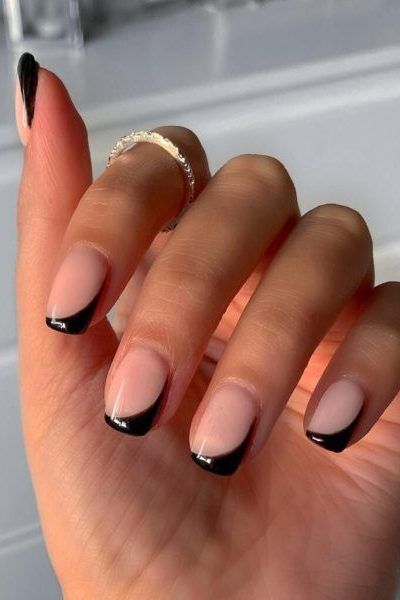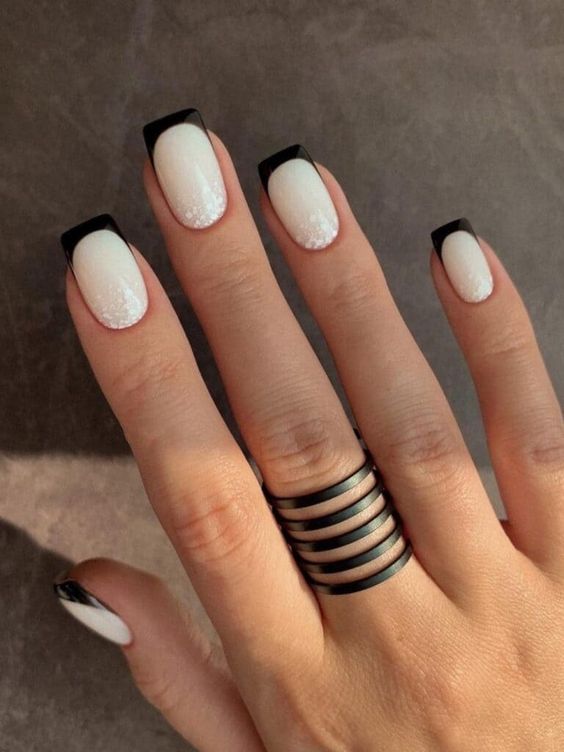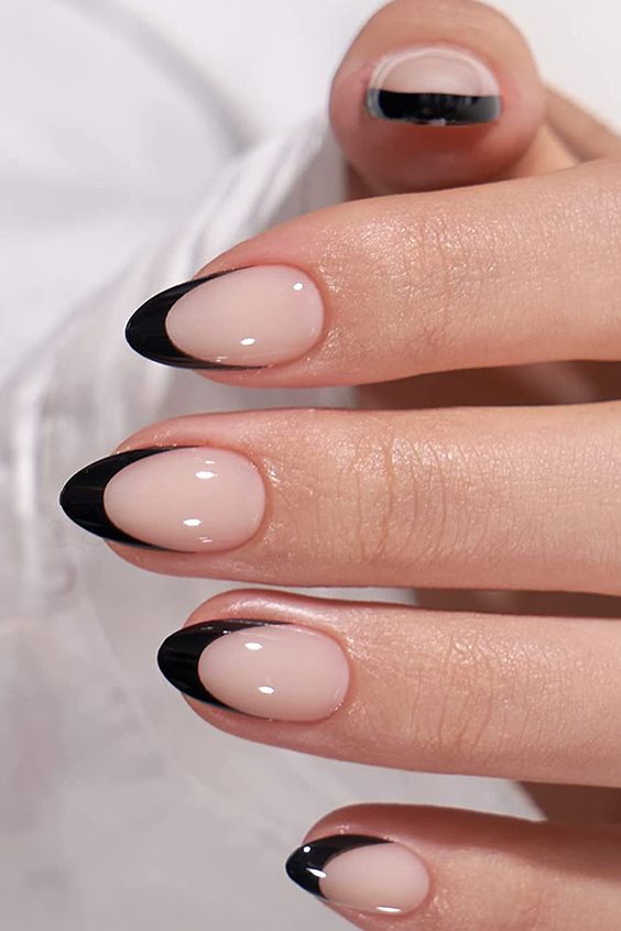 У сезоні осінь-зима 2023-2024 основний акцент зроблено на варіаціях френчу у чорному кольорі. Як відомо, класичний французький манікюр створюють наступним чином: нігтьову пластину покривають неяскравим бежевим або пастельно-рожевим тоном лаку, а на кінчик нігтя за формою півмісяця наносять білий колір. Чорний френч є протилежністю класичному, у ньому вільний край нігтя забарвлюють не білим, а насиченим чорним кольором. А щоб привернути увагу такий дизайн можна урізноманітнити золотими візерунками або поєднанням чорного і білого.