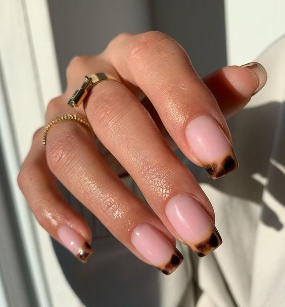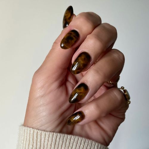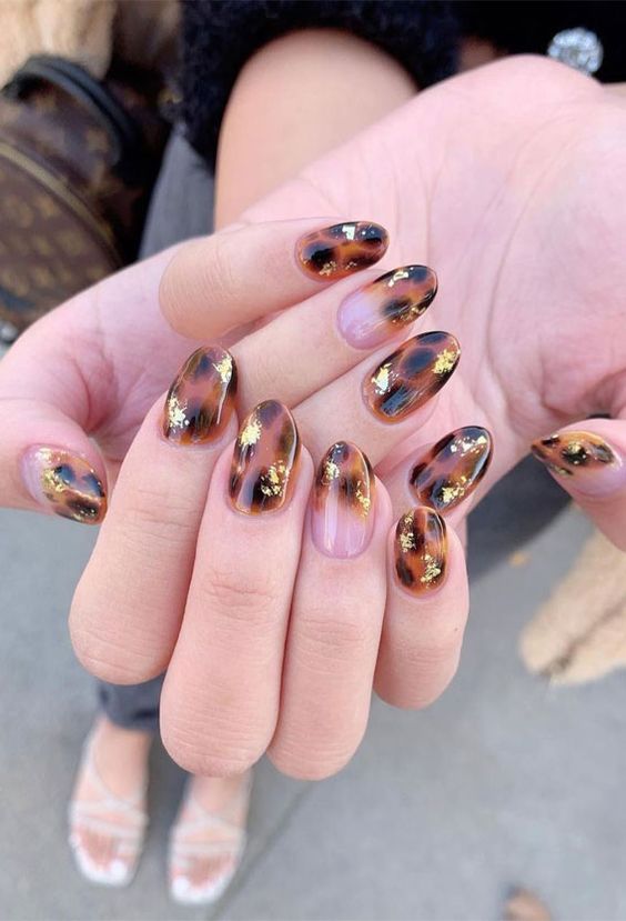 Черепаховий манікюр – стильний ретро-тренд, що асоціюється з відтінками старих оправ окулярів. Цей дизайн знову повертається в моду як на оправах, так і нігтях, і ми бачимо, наскільки він унікальний. Ви можете зробити акцент на вишуканому золотому дизайні. Цим манікюром можна прикрасити всі нігті або скомбінувати з іншим дизайном. Для сучасного образу поєднуйте цей нейл-арт із пастельними нейтральними кольорами.