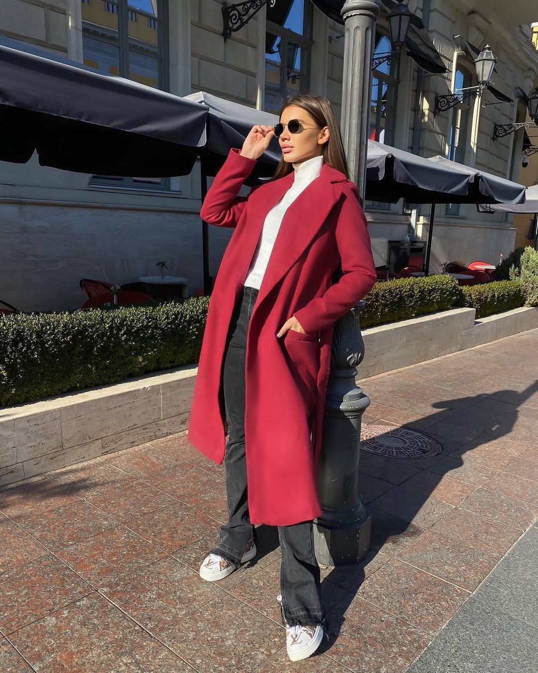 Щоб скласти розслаблений образ, доповніть пальто зручними кедами чи кросівками на масивній підошві. Одягайте однотонну водолазку, чорні джинси та біле взуття. Урізноманітнить лук пальто насиченого бордового відтінку.