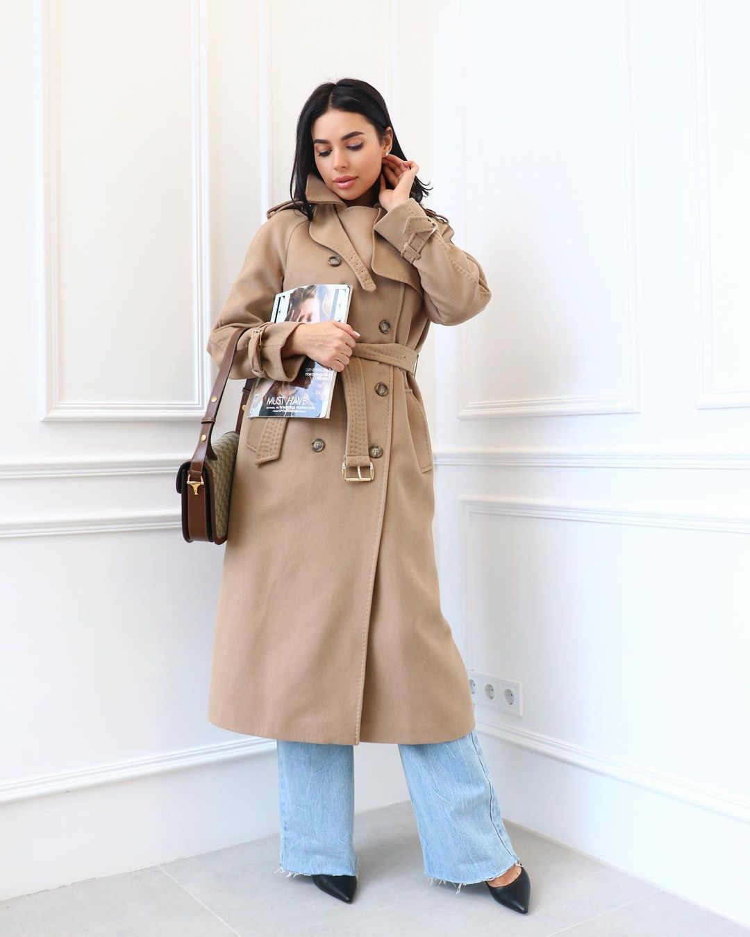 Якщо за вікном досить тепла погода, можна одягнути туфлі-човники на високих підборах, широкі джинси з необробленим краєм, улюблену блузу та зверху накинути пальто прямого крою з англійською коміром. Лінію талії підкреслить акуратний ремінь, а доповнить образ маленька сумка.