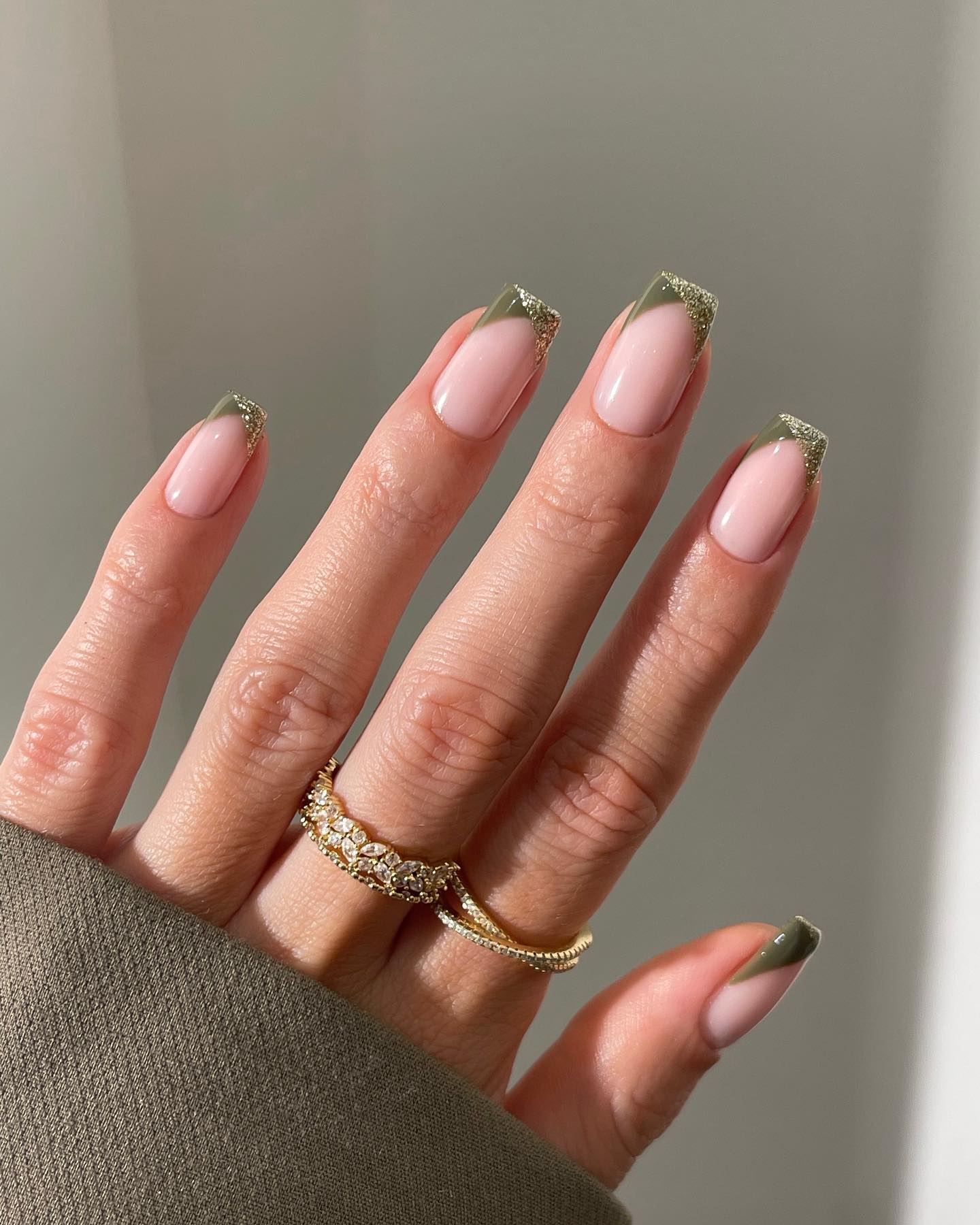 Ще один варіант на зиму – кольоровий френч. Покрийте нігті ніжно-рожевим або тілесним гель-лаком, а кінчик можна зробити кількома відтінками, наприклад зеленим і золотистим лаком із блискітками.
