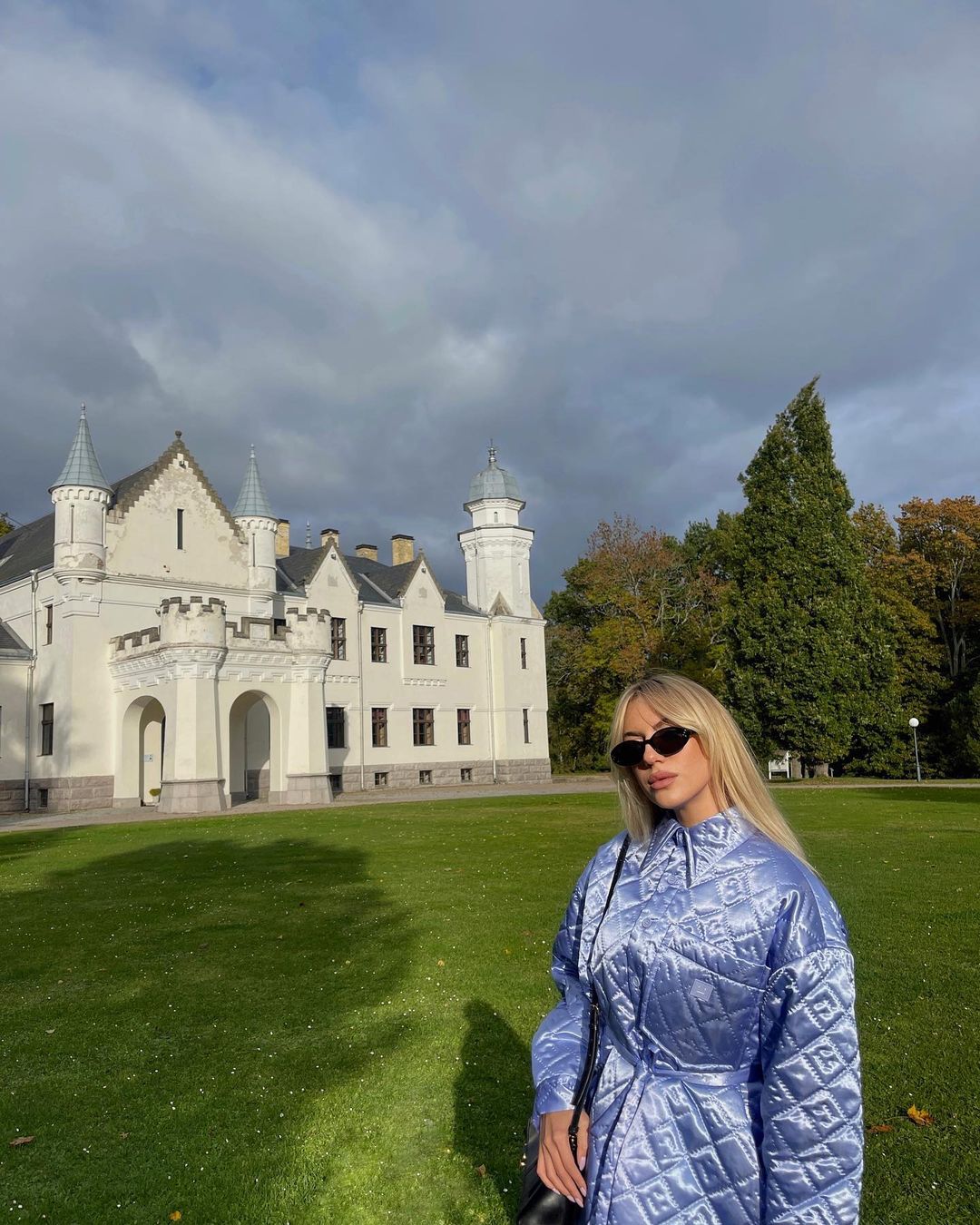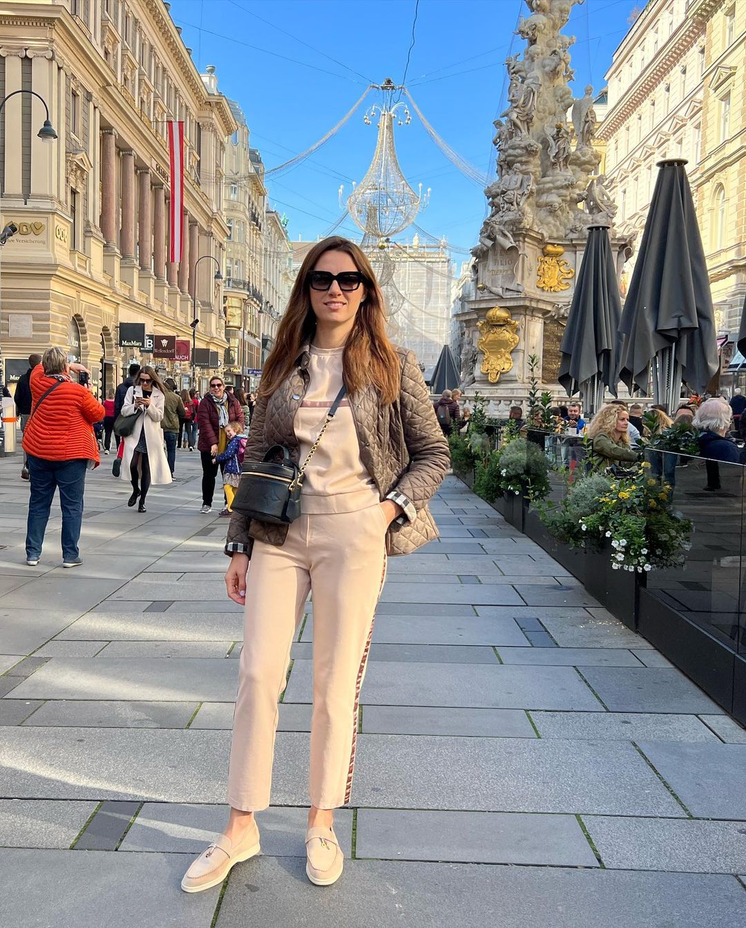 Для прогулянки вулицями Відня, куди вона вирушила разом зі своїм чоловіком у відрядження, Христина вибрала костюм ніжно-персикового відтінку, що складається зі штанів прямого крою з лампасами і світшота. Свій лук вона доповнила зручними лоферами в тон, чорною сумочкою-косметичкою через плече та стьобаною курткою-сорочкою насиченого коричневого кольору.