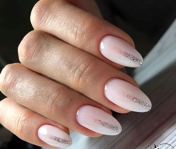 Ще один варіант – покрити нігті напівпрозорим рожевим відтінком, а кінчик і основу нігтя виділити сріблястим гель-лаком з блискітками.