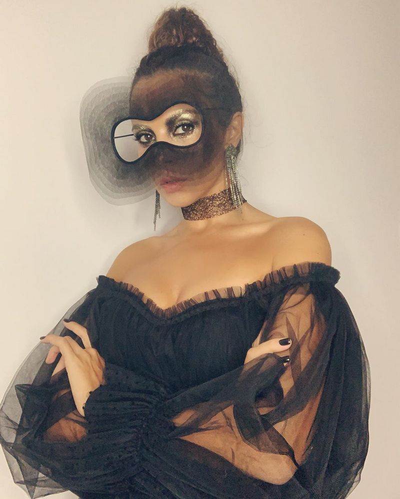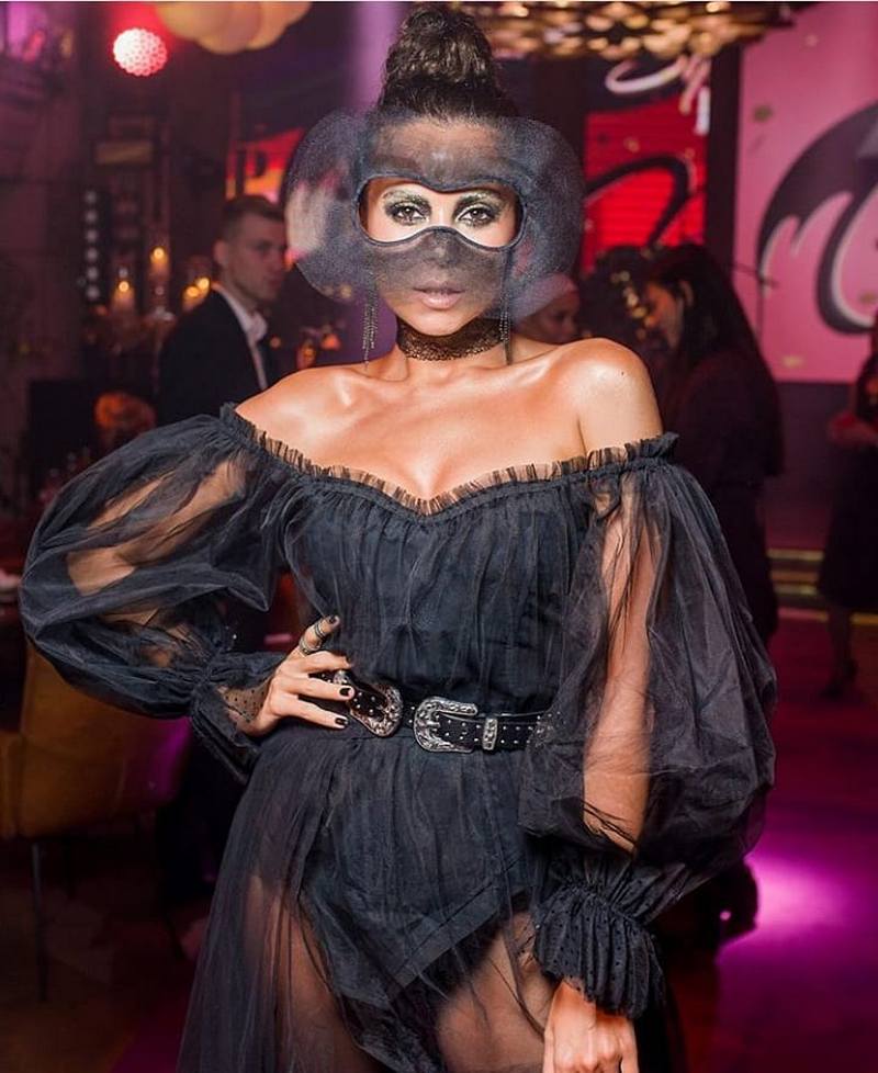 Для заходу Настя вибрала чорний боді, який поєднала з прозорою сукнею. Доповнювали наряд шкіряний ремінь, ботильйони, мереживний чокер і величезна маска-окуляри, яка і привернула увагу фанів співачки.