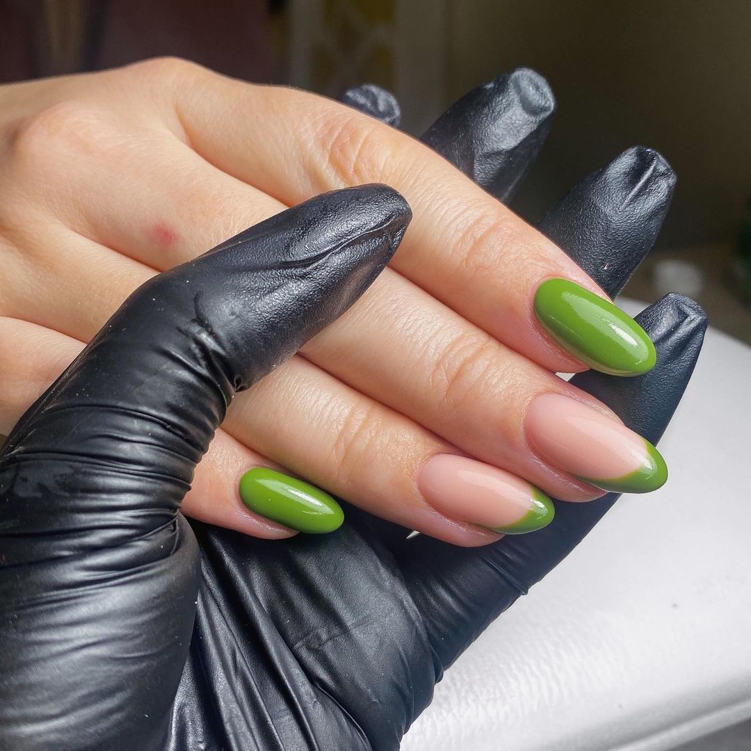 Можна також урізноманітнити нігті незвичним френчем зі скошеним кінчиком салатового відтінку.
