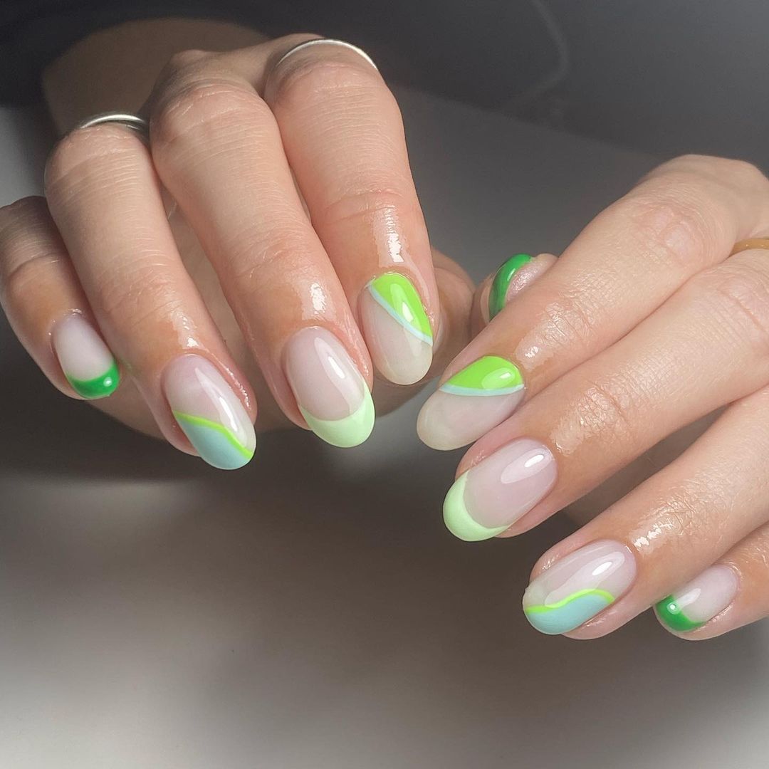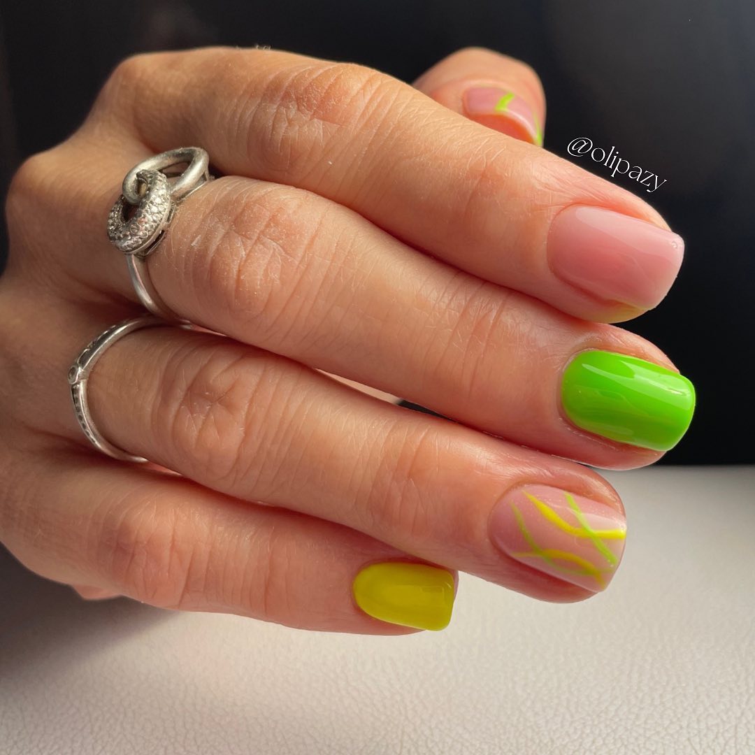 Також в одному манікюрі можна поєднати декілька відтінків салатового та зеленого. Це можуть бути елементи френча або просто хаотичні мазки і лінії різними кольорами.