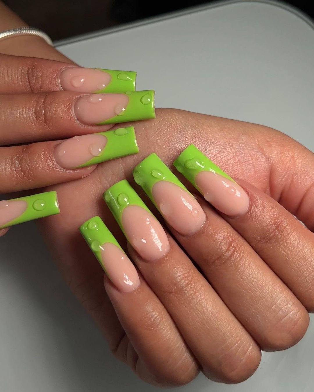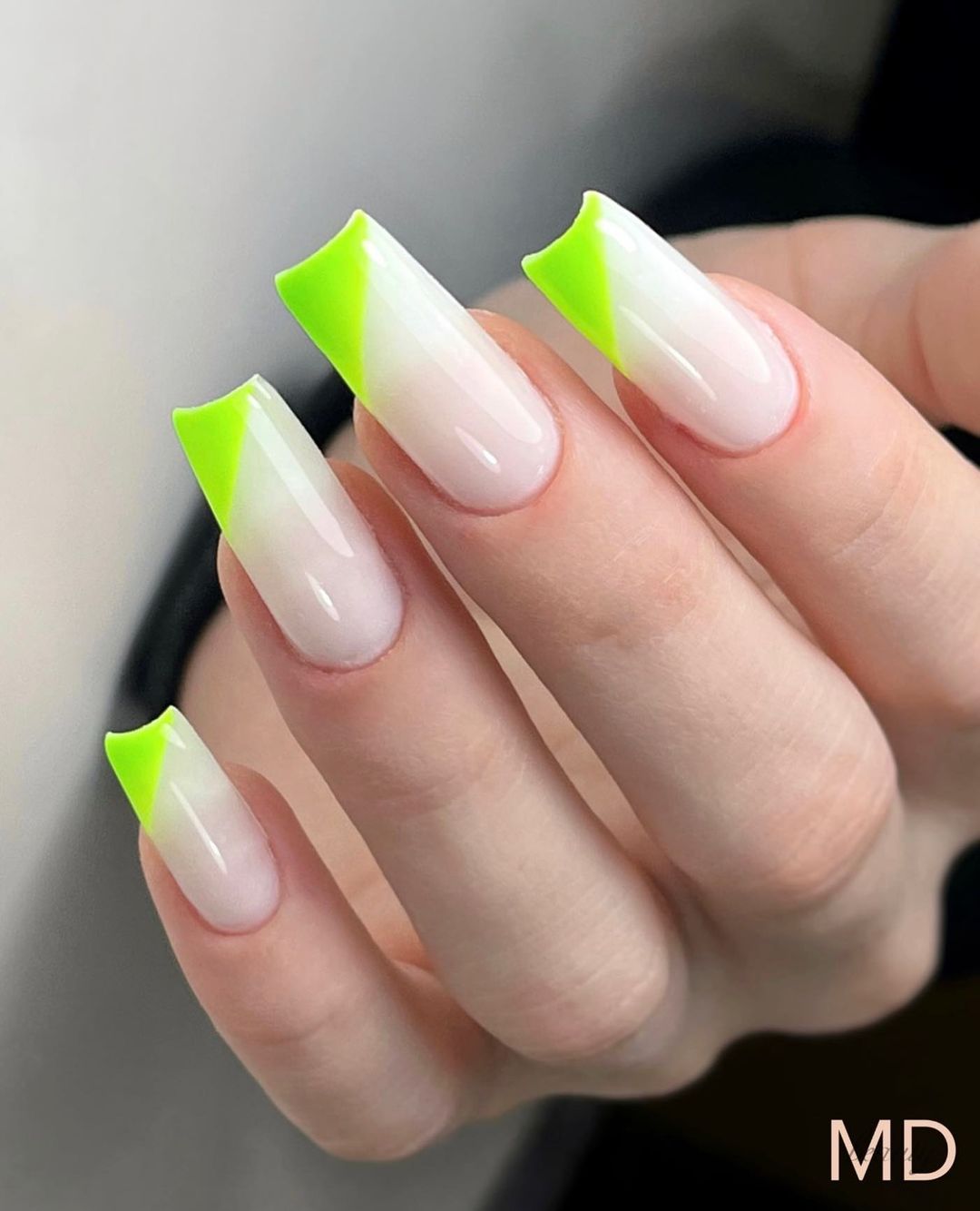 Ще один варіант – зробити незвичний французький манікюр із салатовим кінчиком. Такий нейл-арт гарно виглядатиме на довгих нігтях.