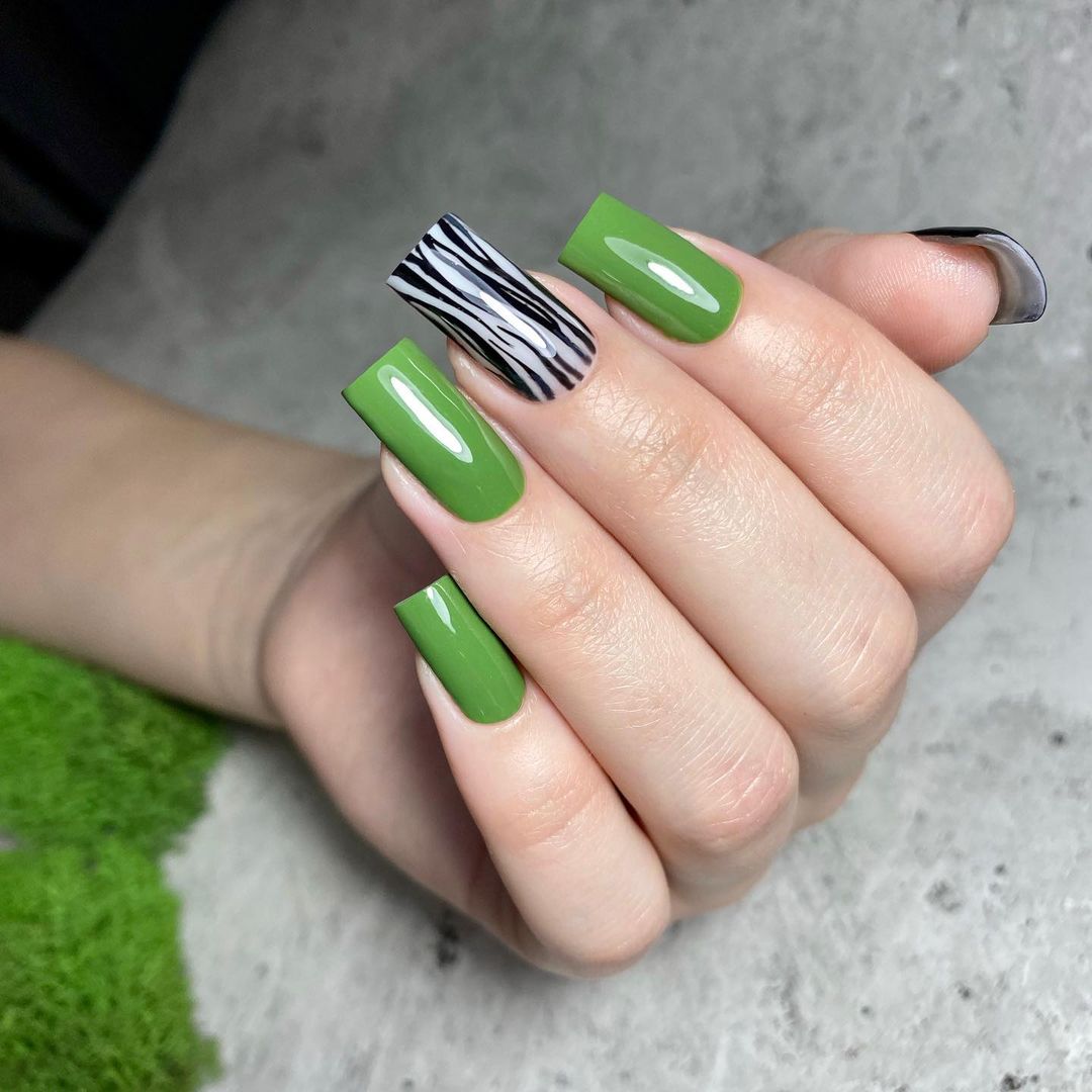 Також салатовий манікюр можна урізноманітнити дизайном із тваринним принтом. Це можна зробити за допомогою стемпінгу – тобто перенесенням малюнка з трафарету за допомогою штампу.