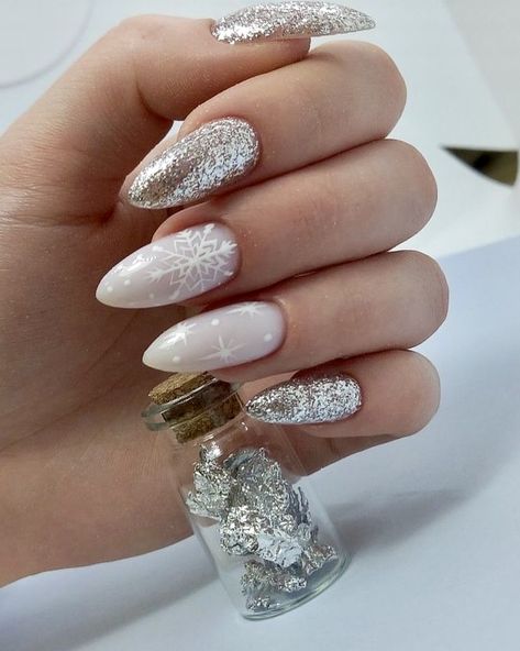 Якщо ж бажаєте сповна відчути святкову атмосферу, додайте до розкішного срібного такі деталі, як сніжинки чи щось подібне. Можна зробити щось на кшталт манікюру, який бачите нижче або ж обрати поєднання кольорів на власний розсуд: