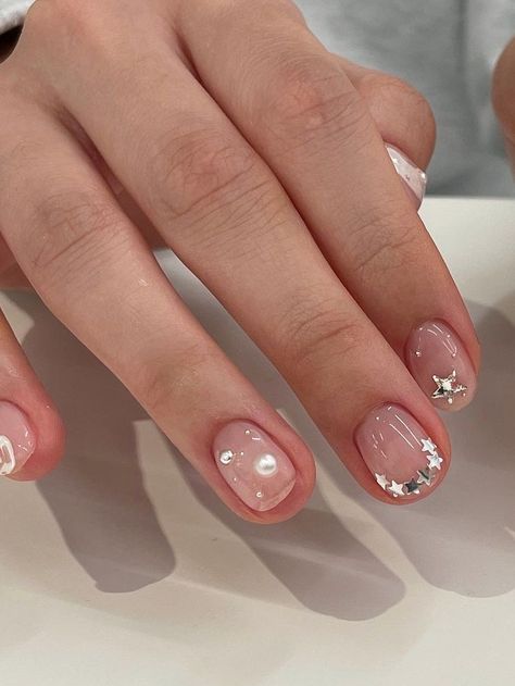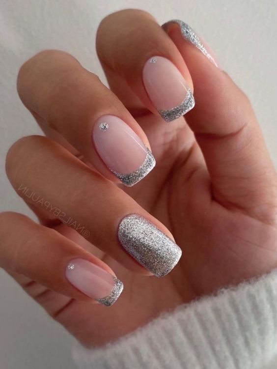 Якщо ви любителька мінімалістичного дизайну, зверніть увагу на наступний варіант. Оберіть базове нюдове покриття тілесного чи рожевого відтінку і додайте кілька деталей у срібних тонах. Можна розташувати їх хаотично або ж обрати щось однакове - робіть так, як буде вам до смаку. Також нижче можете побачити ще один схожий варіант срібного манікюру, виконаного у мінімалістичному варіанті.