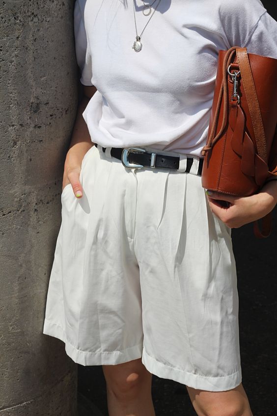 Для стильного повсякденного луку пригляньте лляні шорти-бермуди з високою посадкою. Носити їх можна з білою блузою та зручними шльопанцями на плоскому ходу. Доповніть образ непомітними прикрасами та стильною сумкою через плече.
