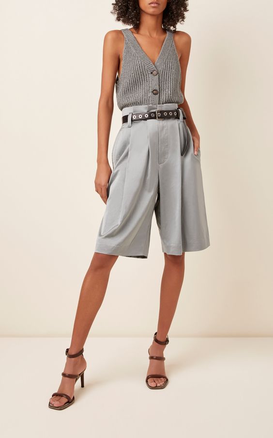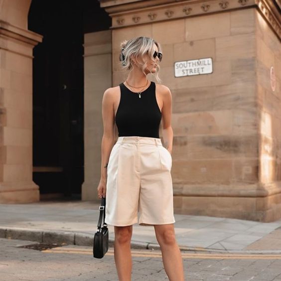 З шортами-бермудами можна створити також ошатний образ. Одягайте шорти з високою посадкою та доповніть їх трикотажною майкою з декоративними гудзиками. Завершать образ відкриті босоніжки на високих підборах, тонкий ремінь та невеликий клатч.