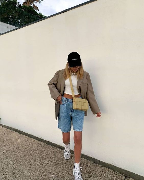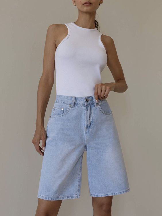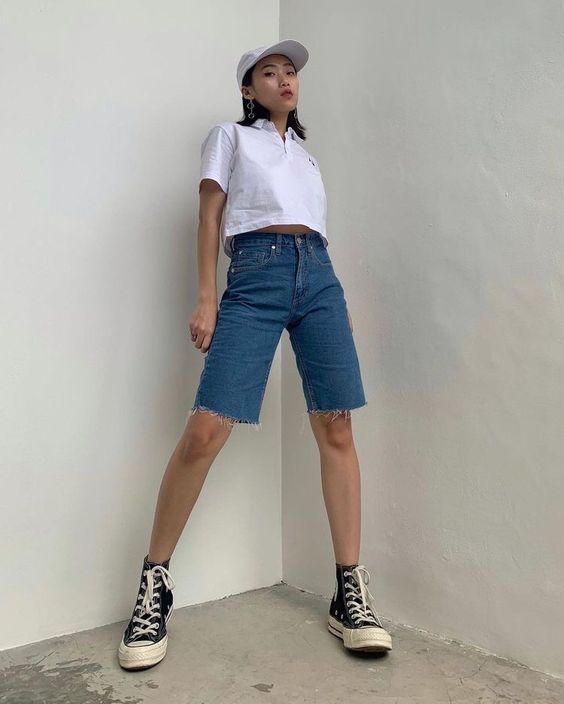 Для неформальних образів підійдуть джинсові шорти-бермуди. Такий фасон можна поєднувати з топами, майками, футболками, а в прохолодніші дні доповнити лук піджаком оверсайз. З трендовими шортами будуть гарно виглядати як кеди і кросівки, так і відкриті босоніжки на плоскій підошві або високих підборах.