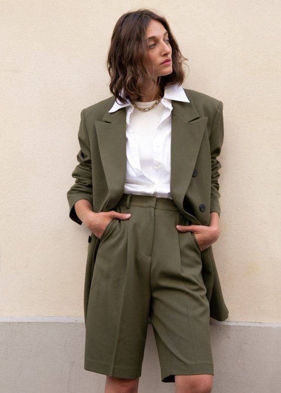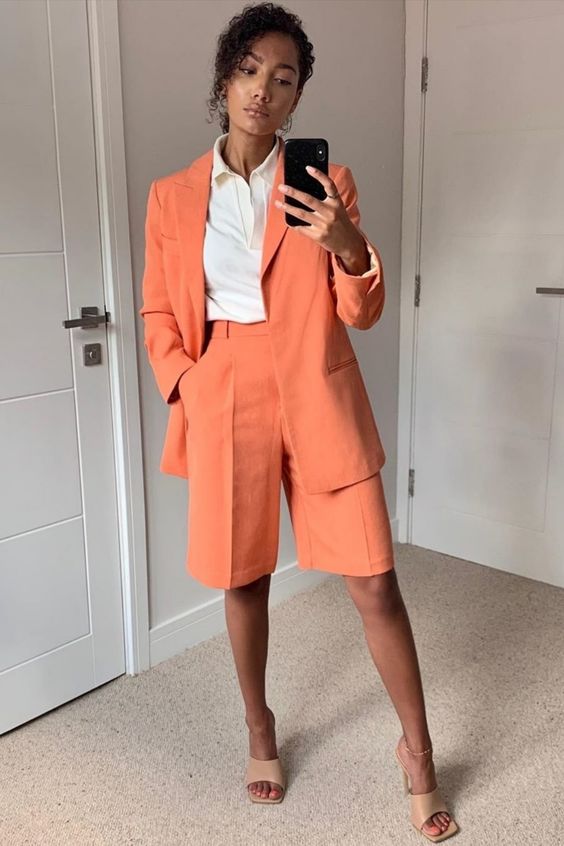 Якщо у вас в офісі немає строгого дрес-коду, підберіть костюм, що складається із шортів-бермудів та піджака. Доповнити його можна базовою білою футболкою чи топом. Із взуттям теж можна поекспериментувати.