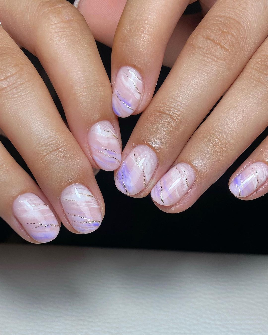 Також можна зробити ефектний мармуровий манікюр, поєднавши прозоре покриття, а також мазки білим, бузковим та золотистим кольорами.