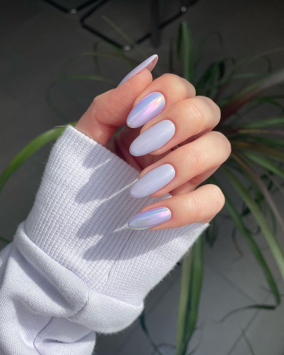 Ще один варіант – покрити нігті бузковим лаком із дрібними блискітками, який на сонці переливатиметься кількома кольорами.