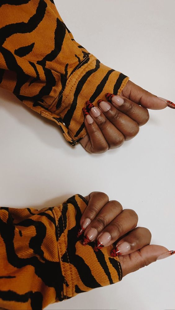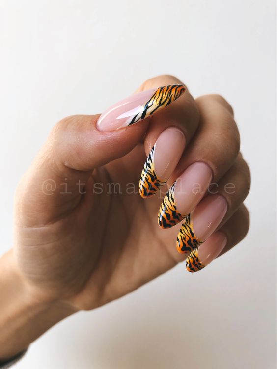Також можна поекспериментувати з французьким манікюром. Нанесіть напівпрозоре або рожеве покриття на основу нігтя, а кінчик прикрасьте тигровим манікюром. Особливо ефектно такий дизайн буде виглядати на довгих нігтях мигдалеподібної форми.