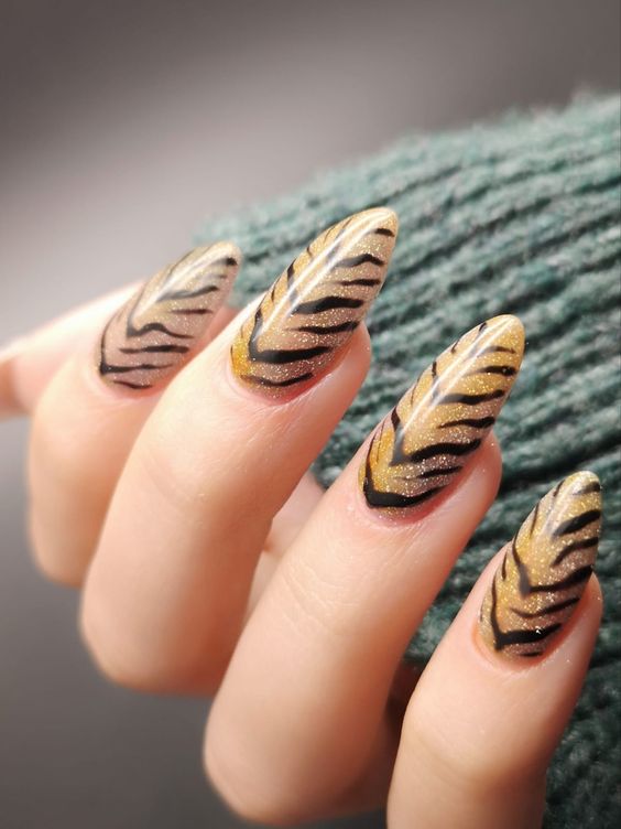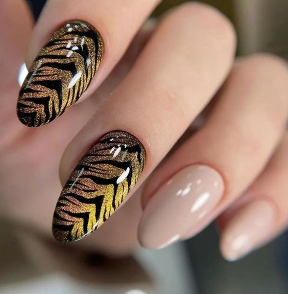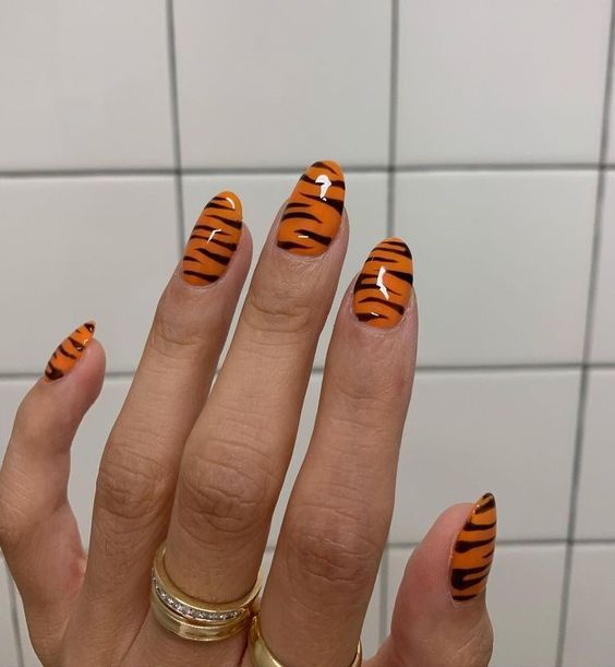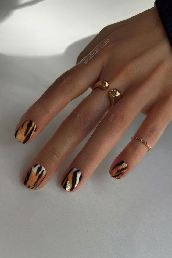 Тигровий манікюр – це стильний дизайн, який відтворює візерунки та кольорову гаму тигрового хутра на нігтях.