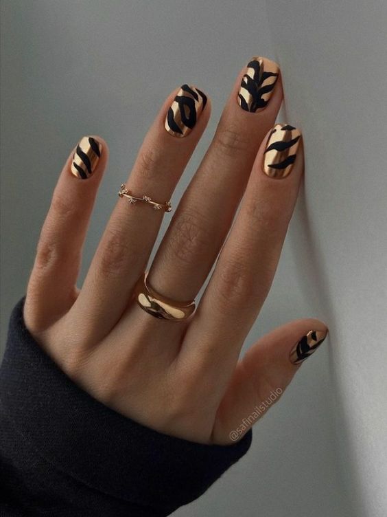 Також для створення тигрового манікюру можна використовувати замість бежевого чи коричневого золотий гель-лак. Такий дизайн у поєднанні з матовим топом виглядатиме дуже ефектно та стильно. Або можна просто доповнити манікюр золотистими елементами - за допомогою фольги.