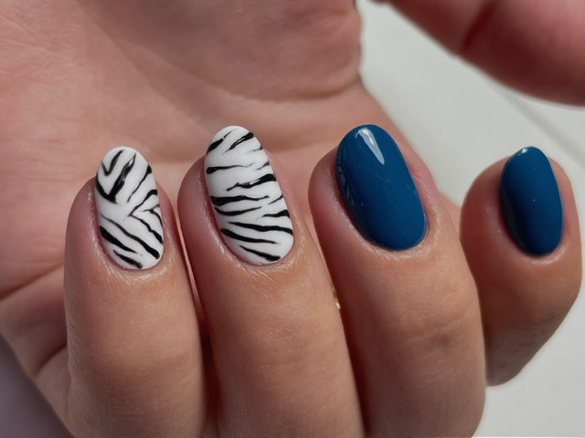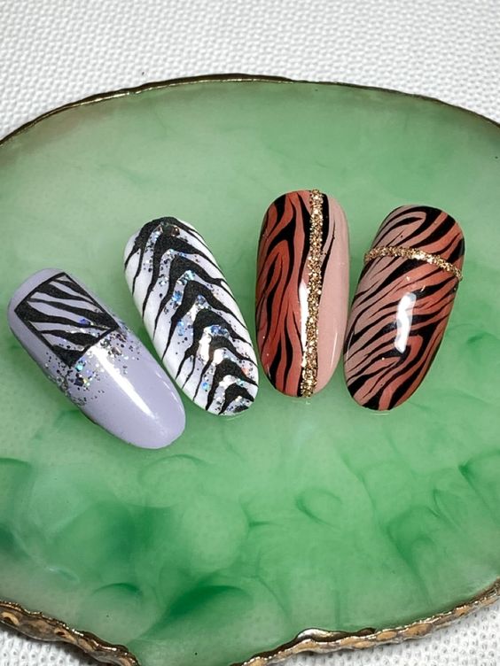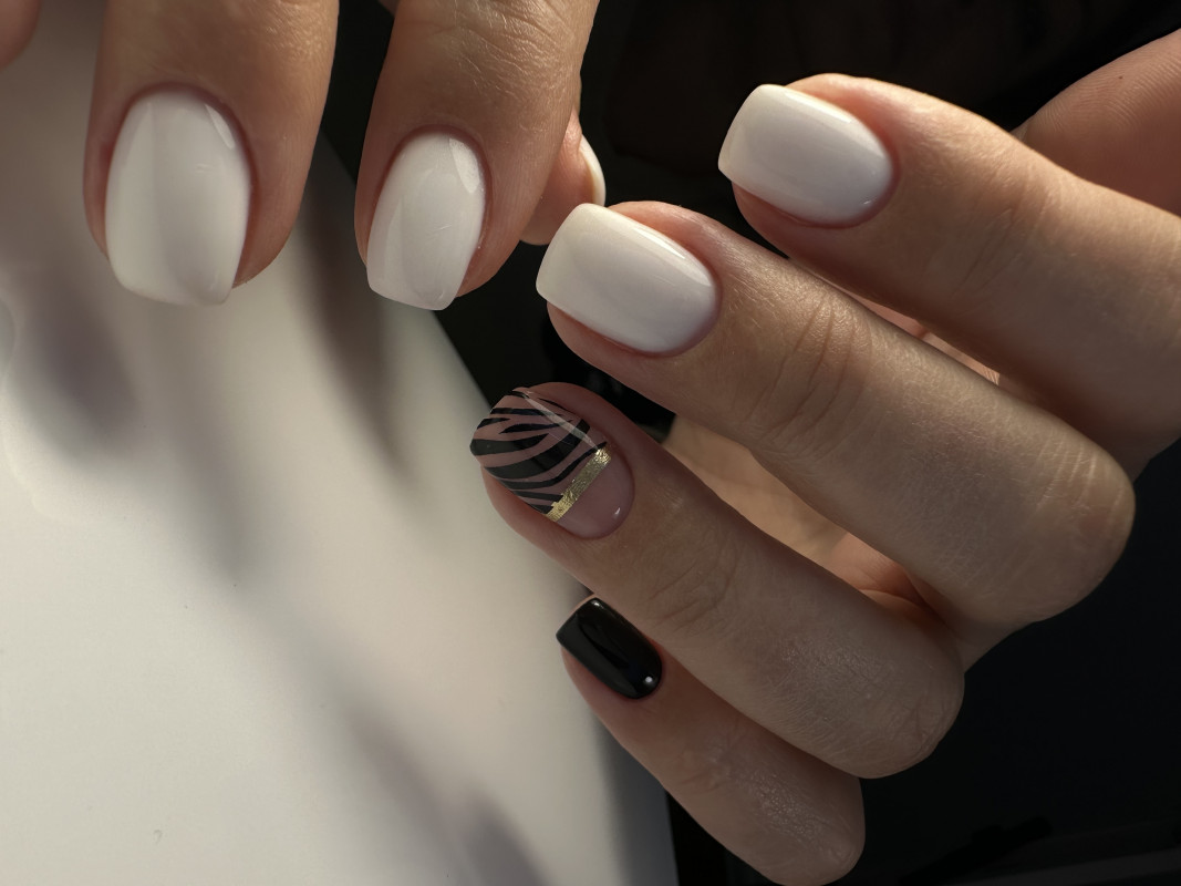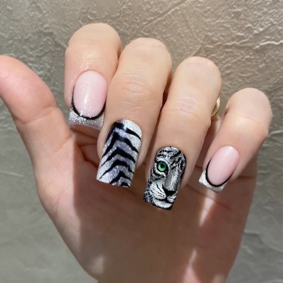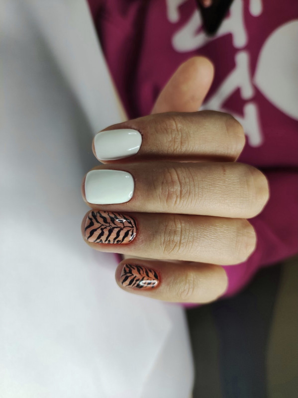 Ще один варіант тигрового манікюру – у чорно-білій гамі. Як відомо, існують бенгальські тигри з білим забарвленням хутра та чорно-коричневими смугами. Такий нейл-арт можна урізноманітнити градієнтним переходом до яскравого відтінку, поєднувати один акцентний ніготь з іншими відтінками гель-лаку або використовувати замість білого кольору для основи сріблястий з дрібними шиммерними блискітками.