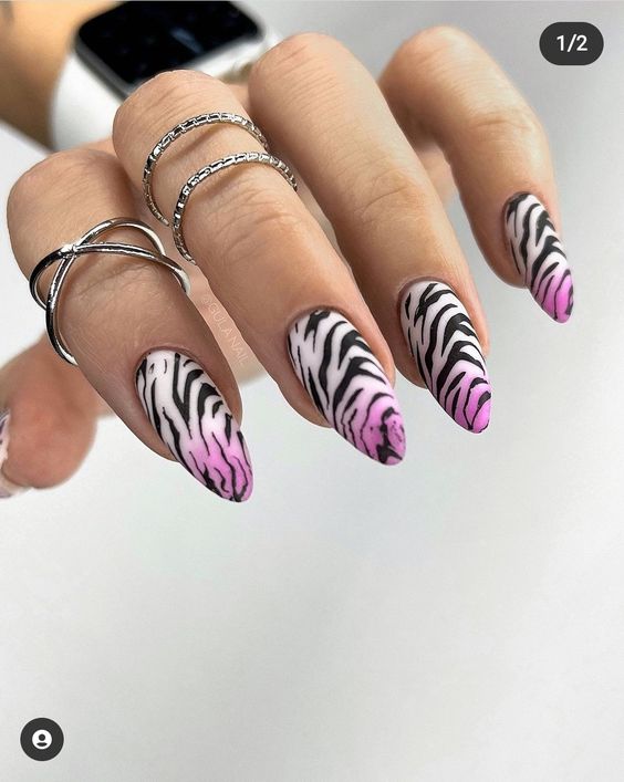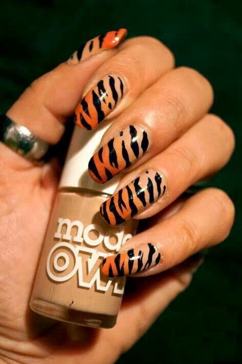 Ще один варіант - манікюр омбре з тигровим принтом. Наносимо світлий помаранчевий або бежевий відтінок на основу нігтя, а потім плавно переходимо до темного помаранчевого або коричневого кольору на кінчиках нігтів, щоб створити ефект омбре. Після цього додаємо чорні смуги, щоб відтворити тигровий візерунок.