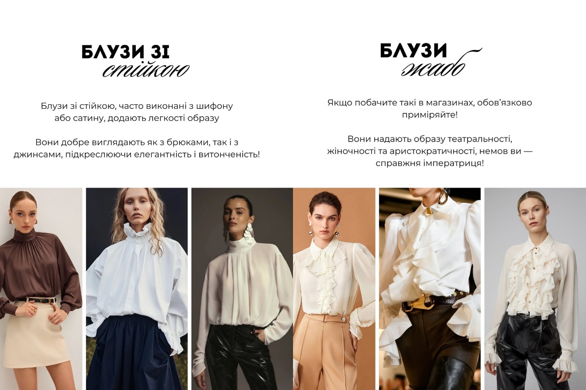 А загалом варто керуватися передусім не трендами, а власними відчуттями та стилем, тоді обрана блуза точно сяде ідеально.