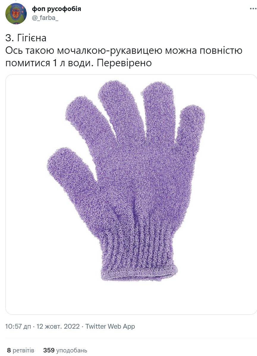 Щоб заощаджувати теплу воду, туристка рекомендує використовувати мочалку-рукавичку. "Такою можна повністю помитися в 1 л води. Перевірено", - пише вона.