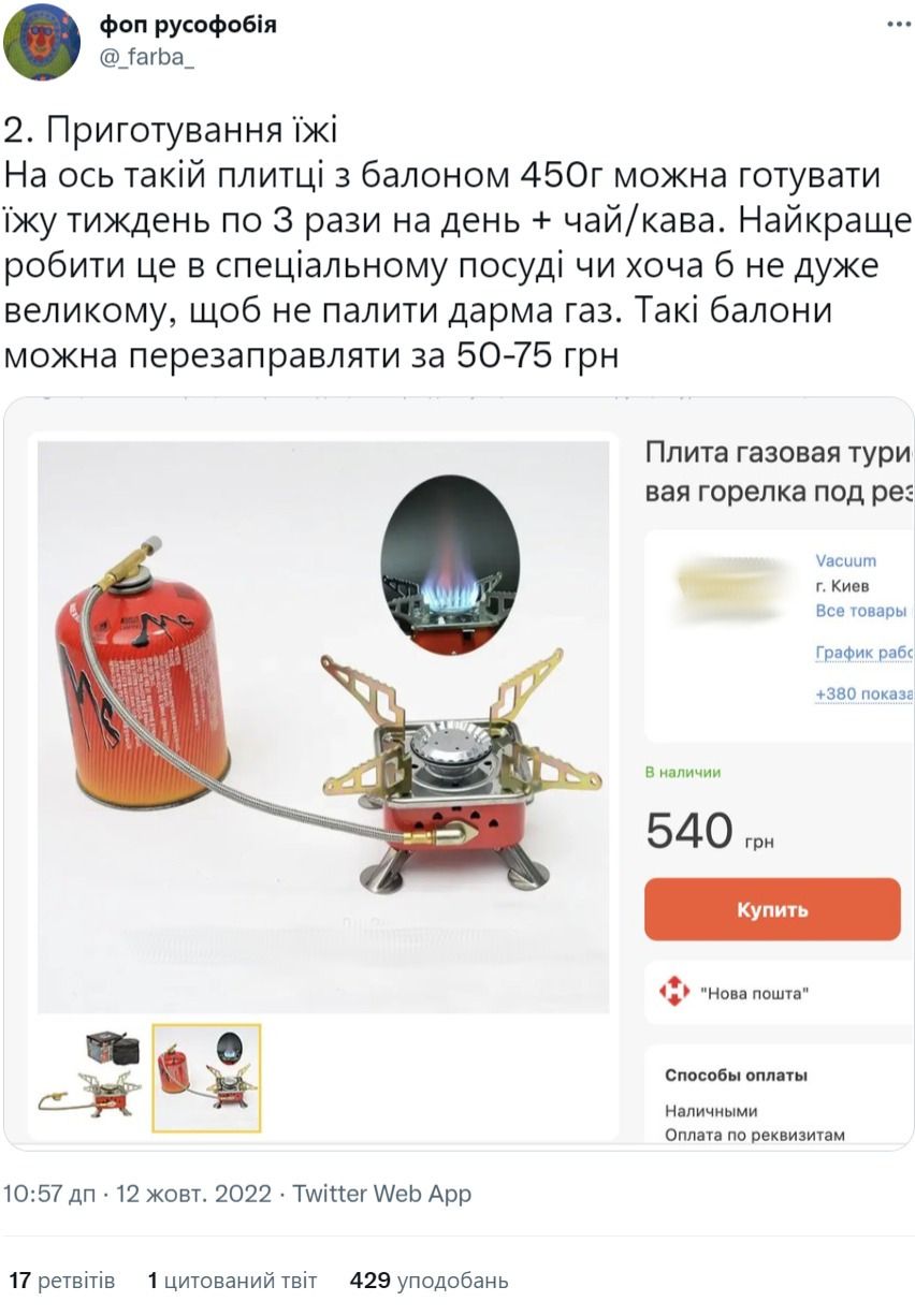 "На газовому туристичному пальнику з балоном 450 г можна готувати їжу тиждень по 3 рази на день, плюс чай і каву. Краще робити це в спеціальному посуді, або хоча б не дуже великому, щоб не палити даремно газ. Такі балони можна перезаправляти за 50-75 грн, - радить вона. - Щоб економити газ, краще готувати швидкі страви: кус-кус, пластівці вівсяні та гречані, можна зробити заготовки для борщу або використовувати готові в пакетах. Гречку взагалі можна не варити, а зливати водою звечора, а вранці просто розігрівати".