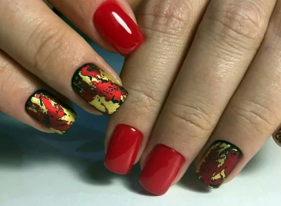 Кольорова фольга добре поєднується з насиченими кольорами гель-лаку, наприклад, з червоним. Крім того, ви можете поєднувати кілька кольорів фольги на одному нігті.