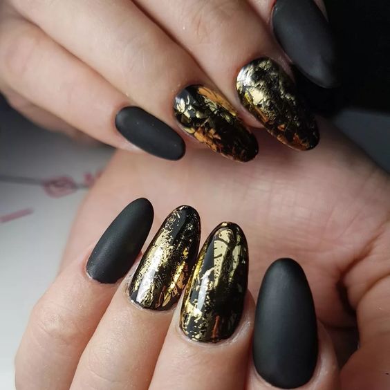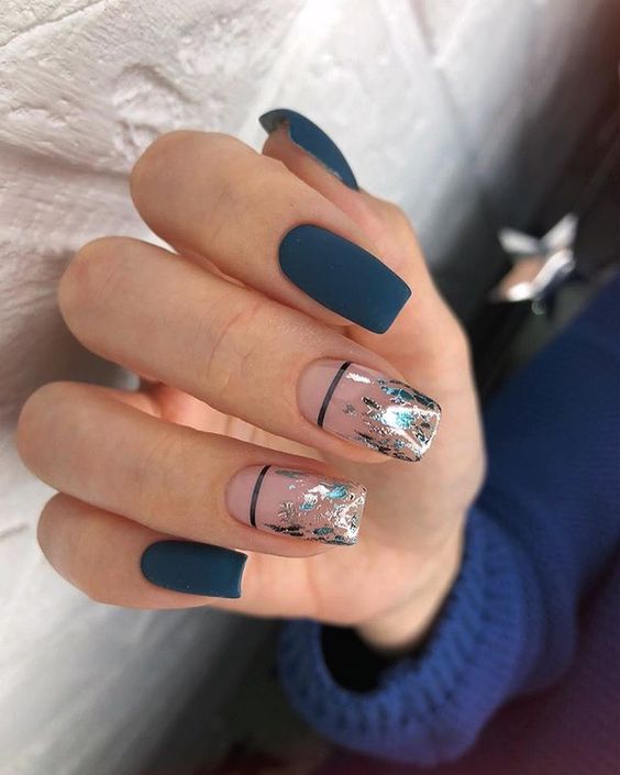 Ще один варіант - покрийте основну частину нігтів однотонним лаком і матовим топом. А один або два нігті залиште прозорими, а потім нанесіть фольгу. Доповнити дизайн можна горизонтальною лінією.