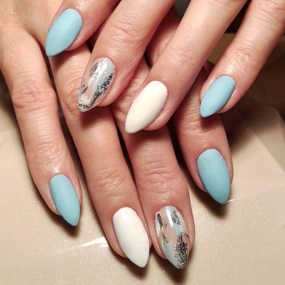 За допомогою білої або сріблястої фольги можна створити незвичайний варіант французького манікюру. Цей дизайн буде добре виглядати на довгих нігтях мигдалеподібної форми.