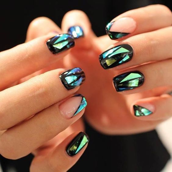 Також можна створити ефект "битого скла" на нігтях. Для цього необхідно взяти голографічну фольгу і нарізати її невеликими шматочками різної форми, а потім укласти на шар гель-лаку.