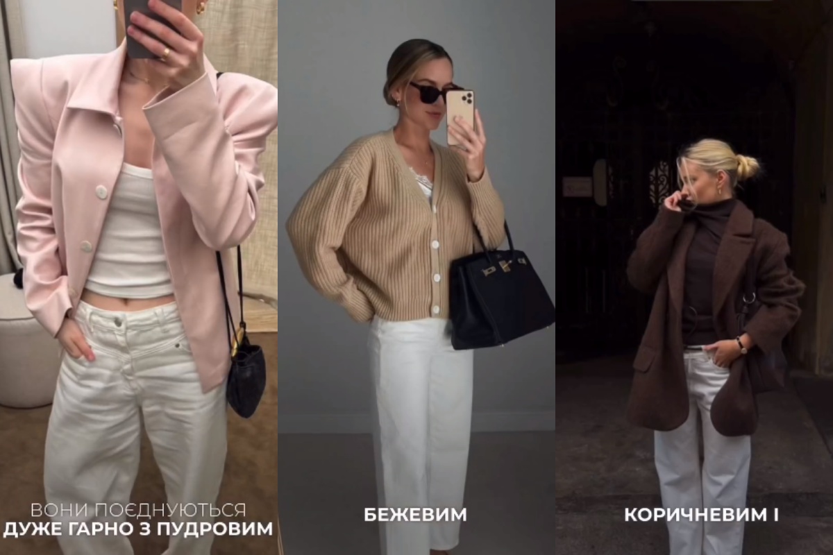 До білих джинсів, які є дуже популярними у весняно-літній період, так і проситься пудровий, бежевий, синій, коричневий та оливковий.