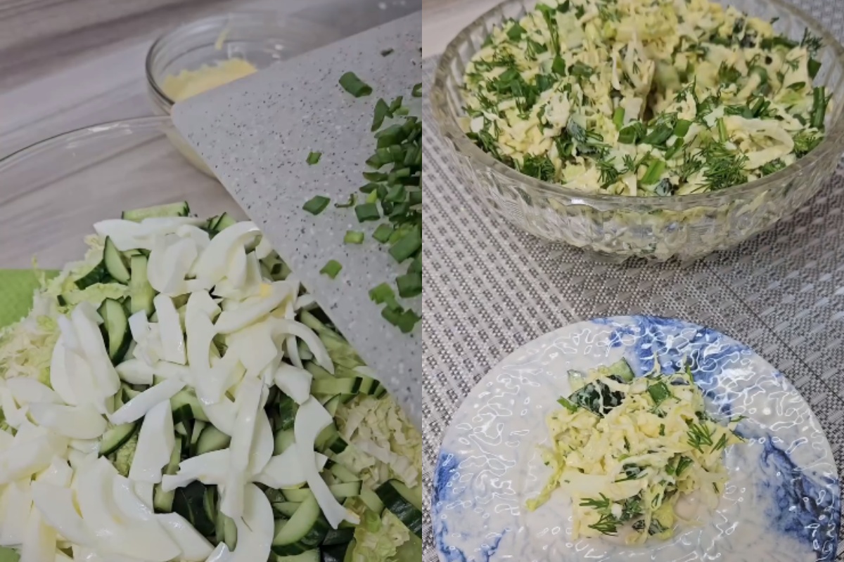 Капусту та огірок дрібно нарізати. Подрібнити зелень.