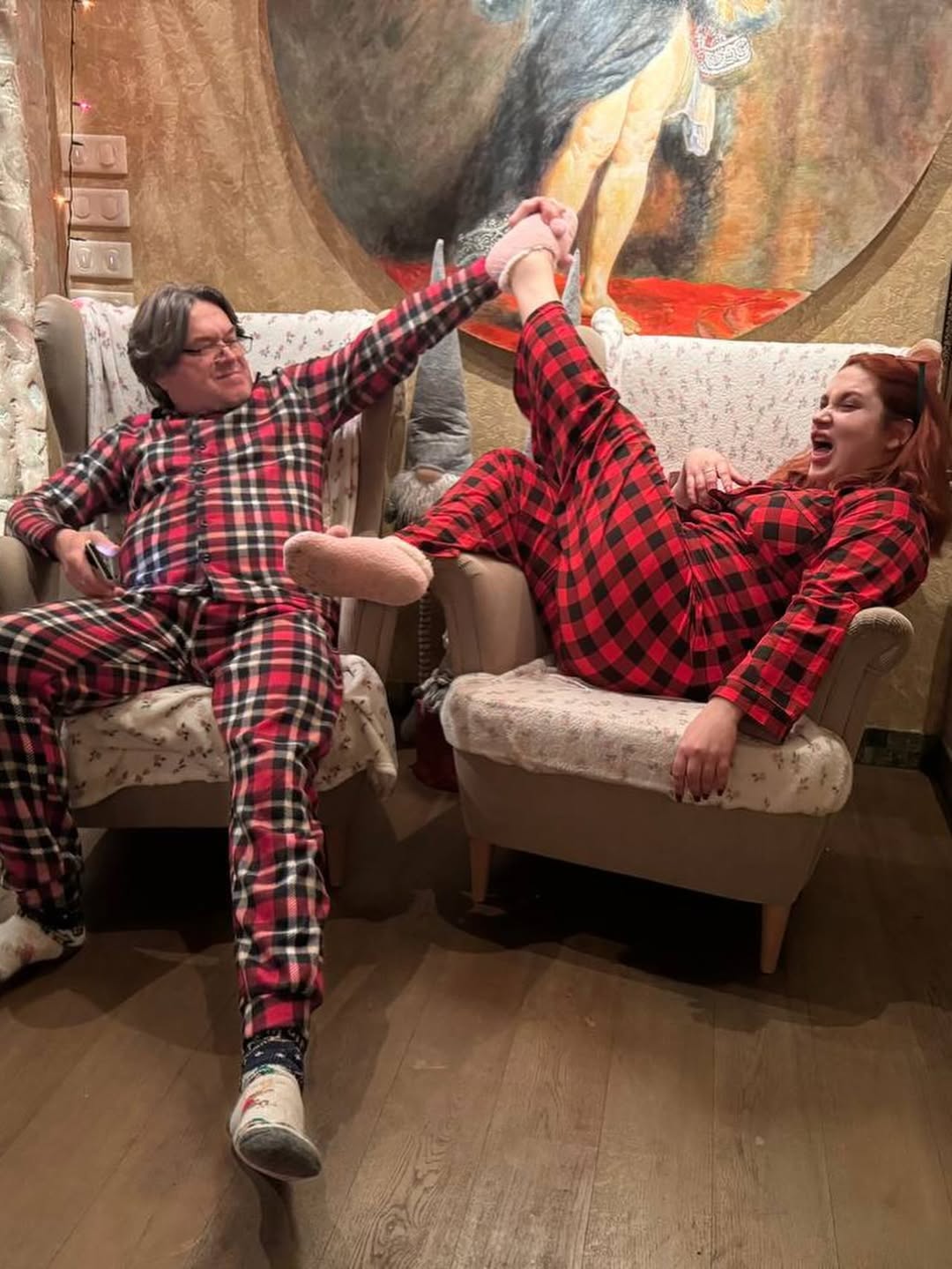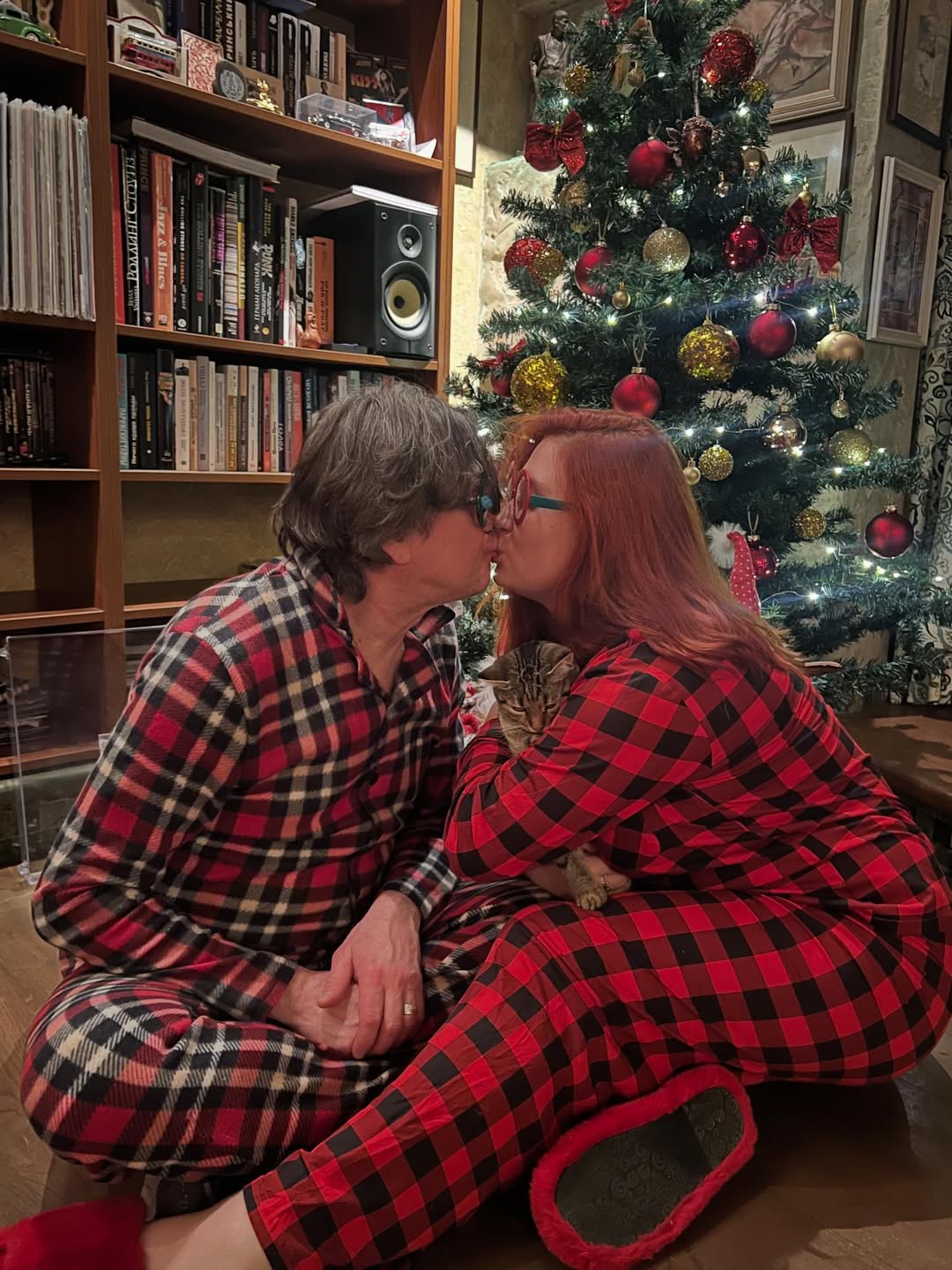 Український актор Остап Ступка та його кохана Маргарита Ткач оприлюднили святкові фото, де вони у яскравих піжамах біля ялинки попивають шампанське та просто весело проводять час. Пара не забула і про домашнього улюбленця.