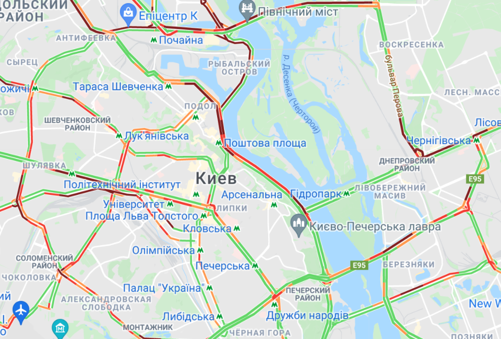 По состоянию на утро четверга, 11 ноября, на улицах Киева образовались длинные пробки в центре, на Оболони и левом берегу. Полностью остановились Набережно-Рыбальская и Набережно-Крещатицкая.