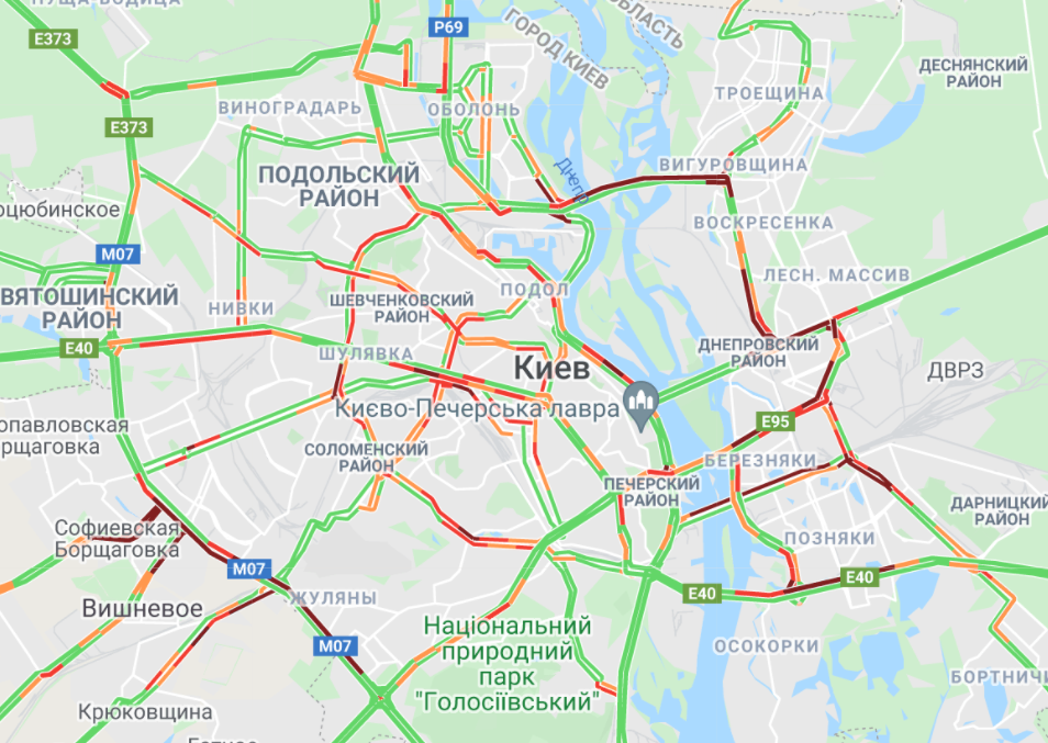 Затруднен проезд авто на проспекте Романа Шухевича, Северному мосту, ул. Братиславская, проспекте Освободителей, а также между станциями метро "Лесная", "Левобережная" и на мосту Патона. Трудно проехать по проспекту Соборности и проспекту Николая Бажана, возле станций метро "Осокорки", "Позняки" и "Славутич". Большая пробка образовалась на ул. Петра Радзина и Дарницком мосту.