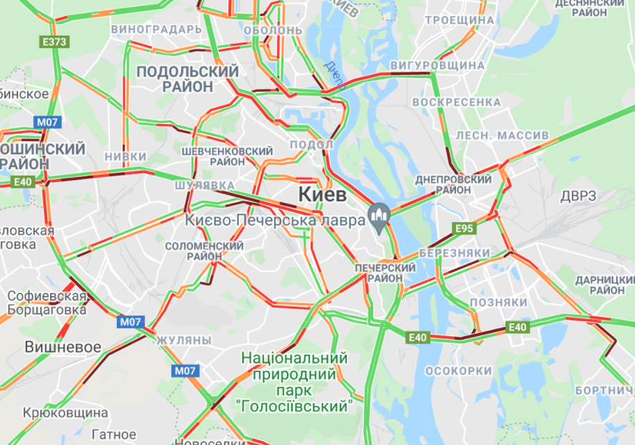 Традиционно заторы образовались на Кольцевой дороге и Софиевской Борщаговке. Трудно проехать по ул. Вадима Гетьмана и проспекту Лобановского (Севастопольская площадь). Немного затруднено движение на Оболони (проспект Бандеры, ул. Вышгородская, проспект Героев Сталинграда). Небольшие заторы образовались на Голосеевском проспекте. Водители стоят в длинной пробке от станции метро "Житомирская" до "Берестейской".
