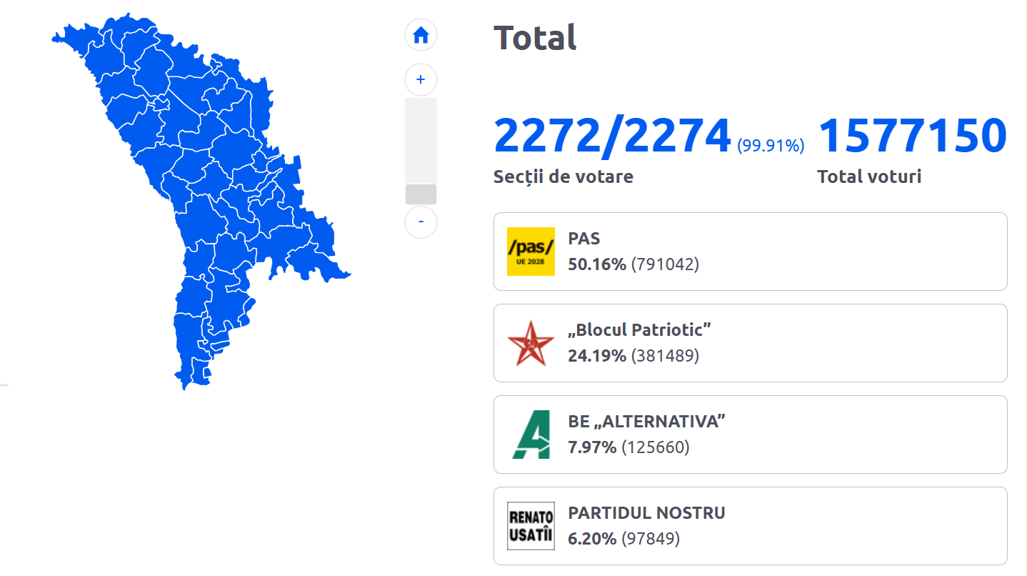 ЦИК Молдовы подсчитал 99,91% протоколов по состоянию на 11:00. Победу одерживает правящая проевропейская партия "Действие и солидарность" (PAS) президентки Маи Санду, получившей 50,16% голосов.