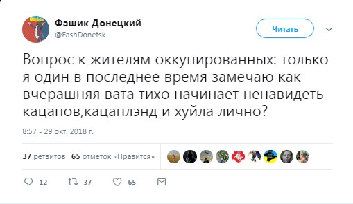 "Вопрос к жителям оккупированных (территорий, - прим. ред.): только я один в последнее время замечаю, как вчерашняя вата тихо начинает ненавидеть кацапов, кацаплэнд и *уйла лично?" – пишет он.