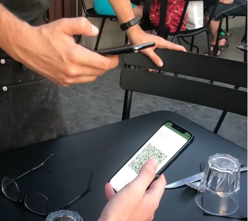 На кадрах видно, что журналист сидит с товарищем в ресторане в одном из городов Франции. К их столику подходит официант и требует предоставить соответствующий QR-код.