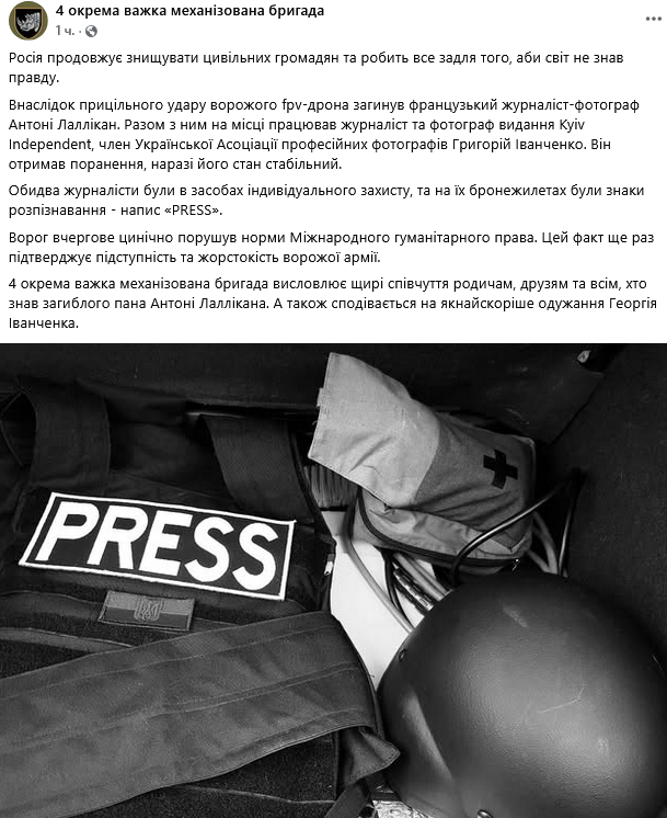 "Россия продолжает уничтожать гражданских и делает все для того, чтобы мир не знал правду. В результате прицельного удара вражеского fpv-дрона погиб французский журналист-фотограф Антони Лалликан", — говорится в сообщении.