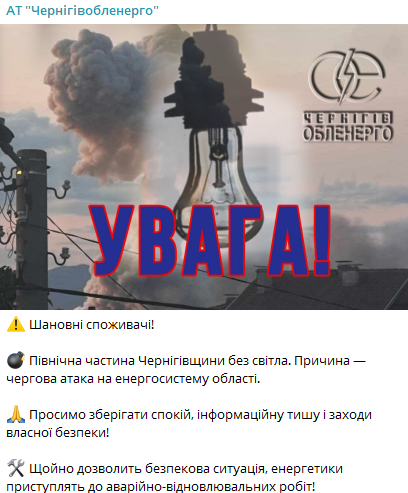 В Черниговском регионе произошло автоматическое обесточивание, а также нет света в разных районах Чернигова. По данным "Укрэнерго", северная часть области осталась без света из-за обстрела энергосистемы.