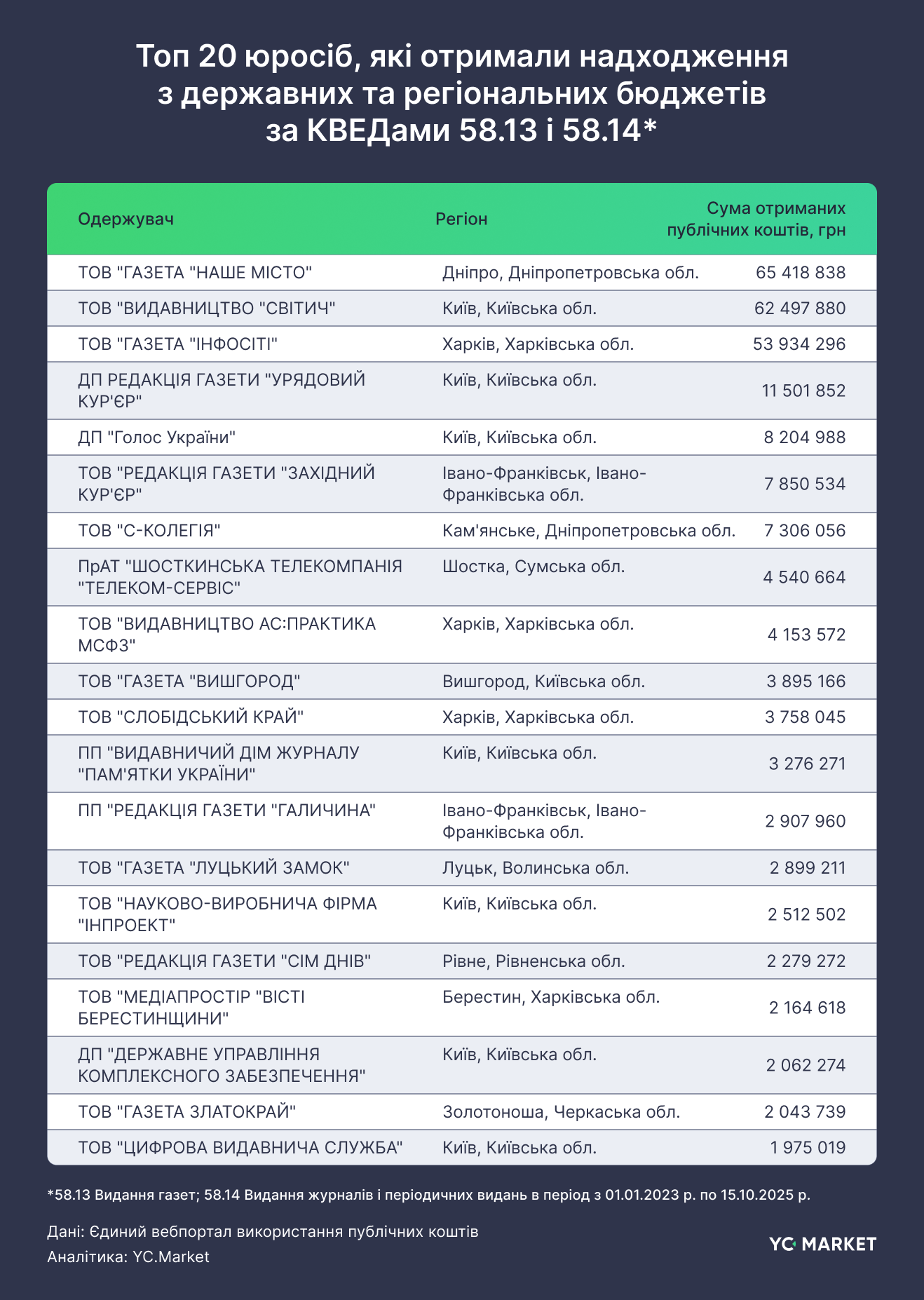 Команда YC.Market во время участия в 10 медийном форуме Donbas Media Forum реализовала исследования юридических лиц, занимающихся изданием газет и журналов. Больше всего таких компаний сосредоточено в Киеве, а больше государственных средств в 2023-2025 гг. получила днепровская газета "Наш город".