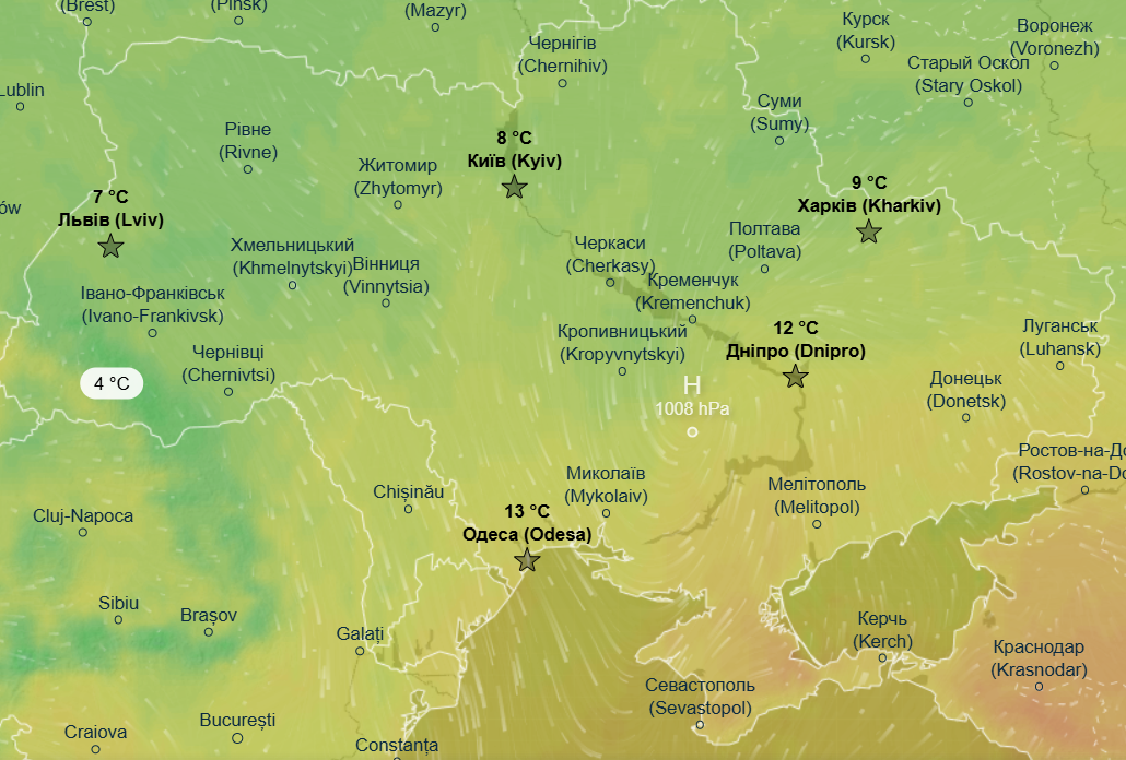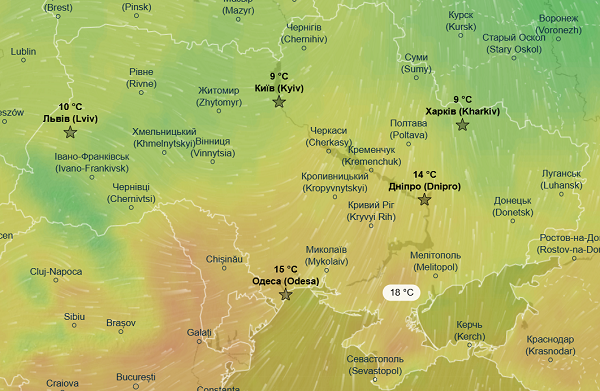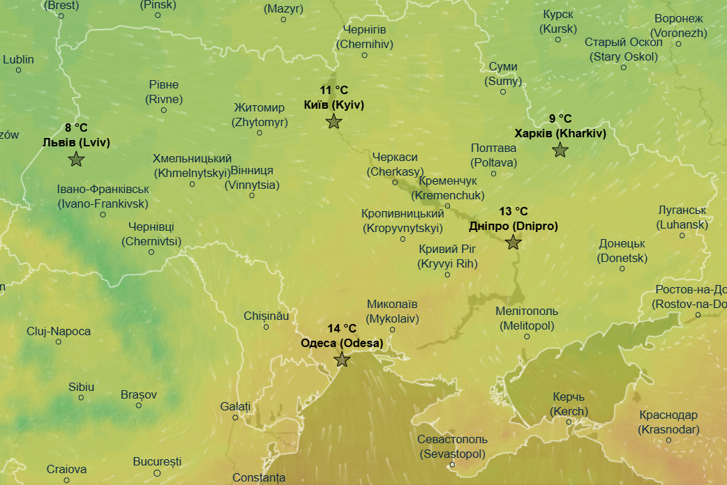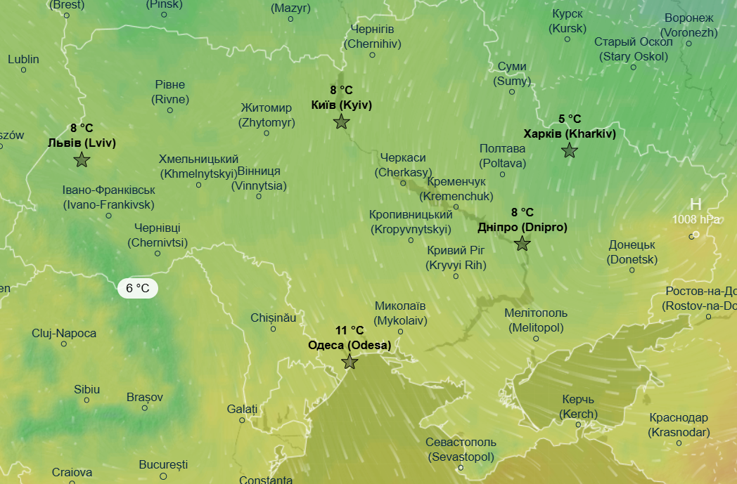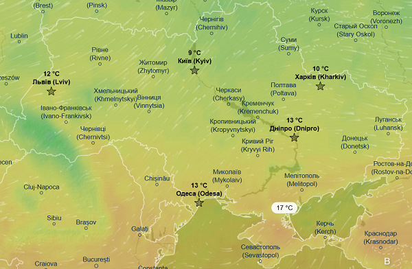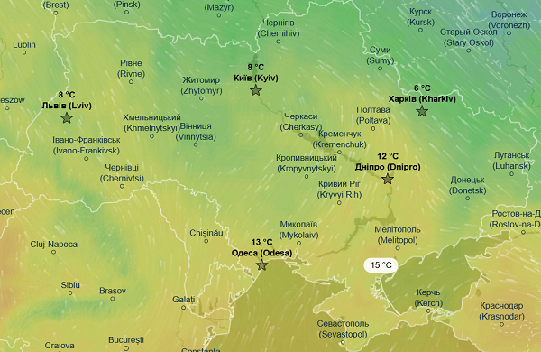 Во вторник, 11 ноября, снижение температуры ожидается в западных, северных и центральных областях Украины — днем столбики термометров в этой части страны покажут от +4 до +9 градусов. В восточных и южных областях днем будет теплее - в пределах +13...+15 градусов.