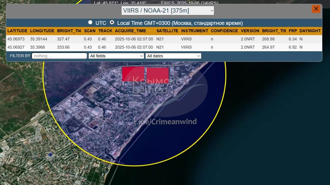 Согласно данным спутниковой съемки, на Феодосийском нефтеналивном терминале зафиксировано два мощных очага пожара.